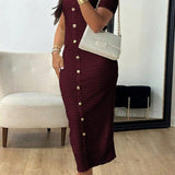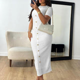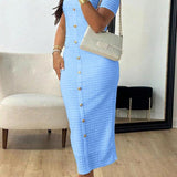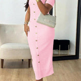 Designed to make you feel instantly polished, this midi dress skims the body with a flattering, feminine line that elevates your presence the moment you slip it on. The softly textured feel adds quiet luxury, while the button-front detail brings effortless structure and confidence. Style it with heels for a refined occasion look or keep it relaxed with flats for chic everyday elegance. A timeless piece you’ll reach for whenever you want to look composed—and unforgettable.